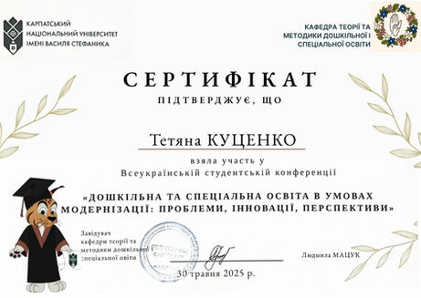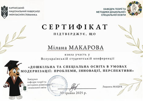 Тут зібрані підтверджені досягнення, які показують академічну активність, професійне зростання та готовність працювати з реальними викликами сучасної освіти. Сертифікати відображають участь студентів як у науково-дослідницькій діяльності, так і в програмах неформальної освіти.